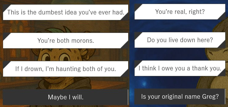 A lot of players have missed it, but there are two secret joke scenes hidden in the current build of Drift. In each one, Korvu makes a surprise appearance, teasing Noah for picking choices that most players probably wouldn’t make unless they were intentionally trying to be difficult. These moments were added purely for fun, a small reward for players experimenting with unconventional dialogue paths.